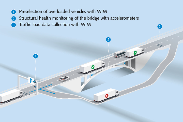 - The WIM system can be combined with further sensors and cameras to, for example, detect speed, the condition of tires and vehicle dimensions, thus contributing to increased road safety on the bridge.