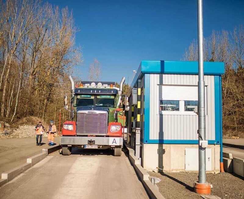The truck scales are equipped with a traffic light system. If the system is not ready for use, this is signaled by the flashing red light. When the scale is zeroed, the traffic light is green and the truck can drive onto the scale. After weighing, the truck starts to the designated unloading point.