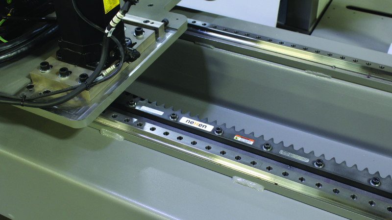 Unlike the traditional rack and pinion system, the RPS features a pinion consisting of 10 or 12 needle-bearing supported rollers that engage a rack tooth profile. The sealed and lubricated rollers move smoothly along the profile, resulting in zero backlash and 99 percent efficient conversion of rotary to linear motion. Maximum speed is 11 m/s (36 fps); accuracy is ±0,03 mm (±0.00118 inch). The tooth profile is lubricated with a high-performance light grease at installation and then every six months, or 2 million pinion revolutions.